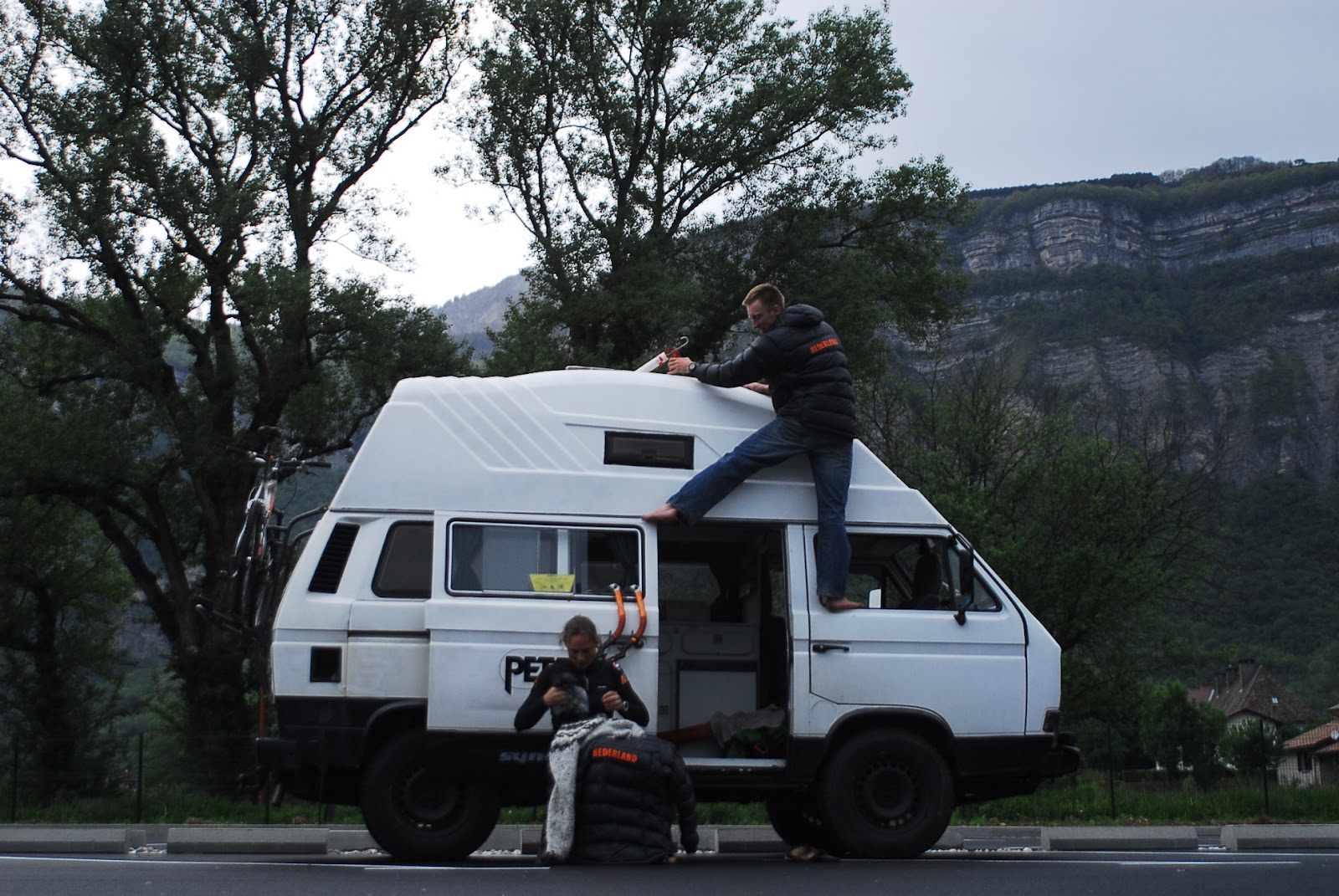 We drove straight after Dennis finished work. As the van has it’s ‘habits’ we suddenly ran out of petrol. Dennis went by bike to get some petrol. The closest station was closed but there was a very friendly French farmer that drove Dennis back to the van (meanwhile I was cooking Ratatouille) with his car and got us some Diesel. We wanted to pay the man, but he was just happy to help us out. After we lost our Diesel to some m*&%$ckin’ Bulgarians a couple weeks ago, this was a real surprise. Thanks mr. farmer! We were quite late so decided to park the van. It became a place close to the river Buech. It rained a lot that night. I was worried that the van would become part of the river, but we were just fine.