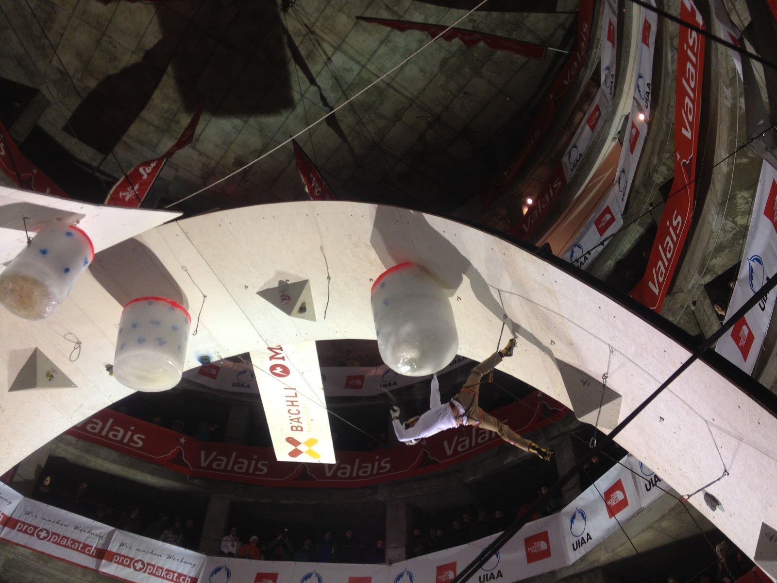 I stalled out on a move to a barrel of ice. Pre-drilled holes, lock off and move was the plan. The hole I went for actually wasn’t that good, and I found with a figure of four would I’d waste my time. I went in the hole again, a bit deeper and suddenly my axe completely slipped out! Having locked off completely I had no back-up with my other axe on the previous hold. Fuuuck, I screamed, off I was… Game over. With more then five minutes of climbing time left I failed, utterly failed to reach the finals. Confused, defeated I just wanted to leave.