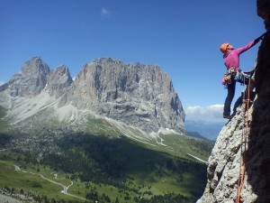 For almost three weeks in the Dolomites. So much to do, so scary, so beautiful! Day 1. Via Demetz-Guck Day 2. We have no idea what we climbed :( The idea was the Messner on the 2. Sellaturm. Some other climbers said the route was wet and bailed without trying. We climbed on what seemed the first pitch and since then we were “lost” on the wall. Every 10 to 15 meters we found something as pro (little cords, scary nut/cam placements and inventive pitons) Meanwhile underneath us another group started and bailed on the first pitch… Thanks to Dennis motivation and all our pitons we made it to the top. A local guide told us that the route was almost always wet and he had big respect for us climbing the face of that wall. He also told us the actual start of the route was more to the left. No idea which ‘left’ he meant. The Messner is originally just 8 pitches graded UIAA 6. We did it in at about 15 pitches with all the traversing. The grade felt like somewhere in between UIAA 6 and 7+. Welcome to the Dolomites?