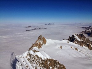 Vanaf de Helbronner (Italiaanse kant) hebben we ons een weg over de gletsjer gegraven. Eigenlijk meer een tunnel dan een pad. Het waaide zo hard dat na 5min het pad weer verdwenen was in de verse poedersneeuw. We klommen een ‘mixed’ route. Rots en een dun laagje ijs. Voorzichtig klom ik omhoog. Dit was in de zomer super makkelijk. Zelfs iemand met nauwelijks klim ervaring kan er dan omhoog komen. Met -20, een dikke laag sneeuw en een flinterdun laagje ijs was de route moeilijker dan de Noordwand van de Eiger (alleen wel korter). En dan was er de constante wind die de sneeuw om ons heen blies en me regelmatig uit balans bracht. Afzekeren was lastig, want de nuts, pitons en cams bleven nauwelijks zitten in de ijzige spleten…