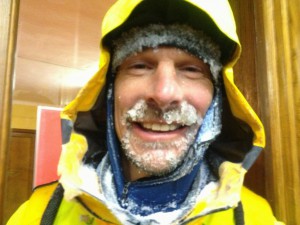 Het weer was veranderd van helder en winderig in stormachtig met sneeuw. We zagen letterlijk onze eigen voetstappen niet meer achter ons. Met kaart, kompas zochten we een weg terug naar de hut. Regelmatig vielen we in de nu onzichtbare gletsjerspleten en zwommen we weer omhoog. Onze gezichten waren bevroren, stap voor stap kompas recht vooruit kostte het ons 3uur om weer bij de hut uit te komen…